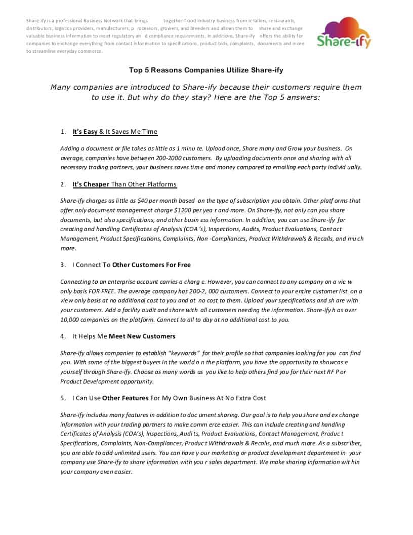 Join more than 22,000 companies that are on Share-ify so you can quickly store and transmit product specifications, third party audits, COA's, certifications, and other critical data with your supply chain partners via a secure private social network.