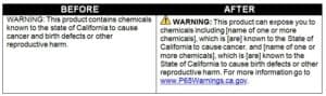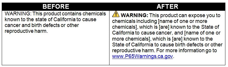 The new warning label language and symbol requirements under Proposition 65 include the following: