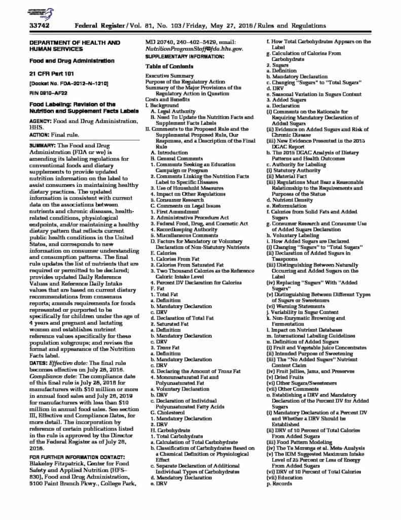 The final rule updates the list of nutrients that are required or permitted to be declared; provides updated Daily Reference Values and Reference Daily Intake values that are based on current dietary recommendations from consensus reports; amends requirements for foods represented or purported to be specifically for children under the age of 4 years and pregnant and lactating women and establishes nutrient reference values specifically for these population subgroups; and revises the format and appearance of the Nutrition Facts label.